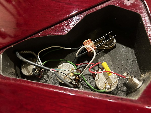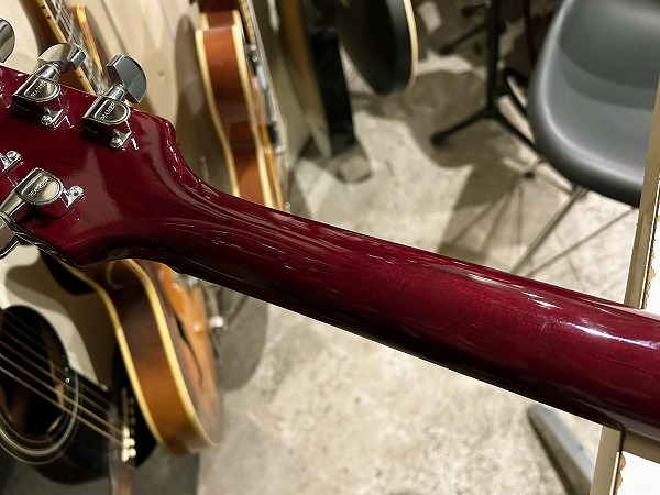 Paulの流れと同社のエクスプローラーの両方の中間のような非常に格好良いルックスで、Cheap Trick リック・ニールセンの愛用HAMERなども思わせる1本です。ブリッジはチューン・オー・マチック+ストップテイルピースタイプ、ペグはHAMER刻印入りシャーラーペグです。ピックアップにはSeymour