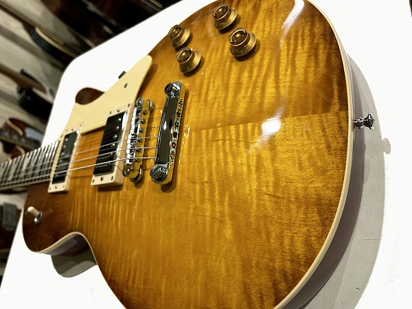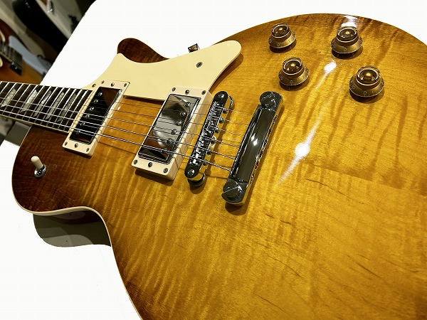 Les Paulを踏襲していますが、オリジナルのシェイプ、アレンジが加えられながらもクラシカルな伝統的雰囲気と独自の個性を持ったルックスに仕上がっています。まず目を惹くのはトップのフレイムメイプルで、レモンバーストのヴィンテージライクなカラーとのマッチングで非常に本格的かつ上質な仕上がりです。Heritageはより上位グレードのCustom