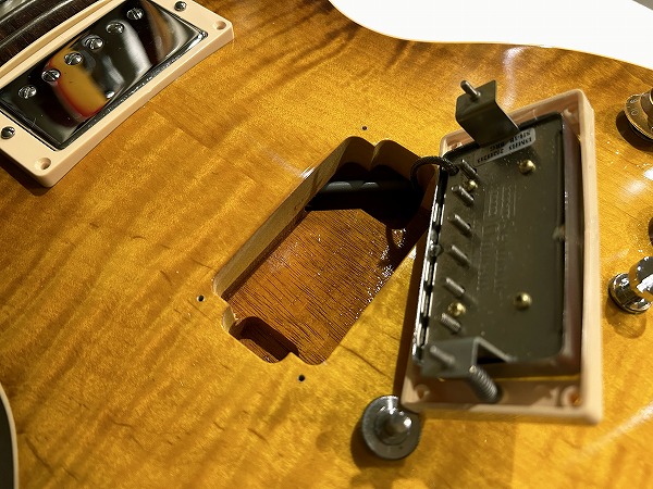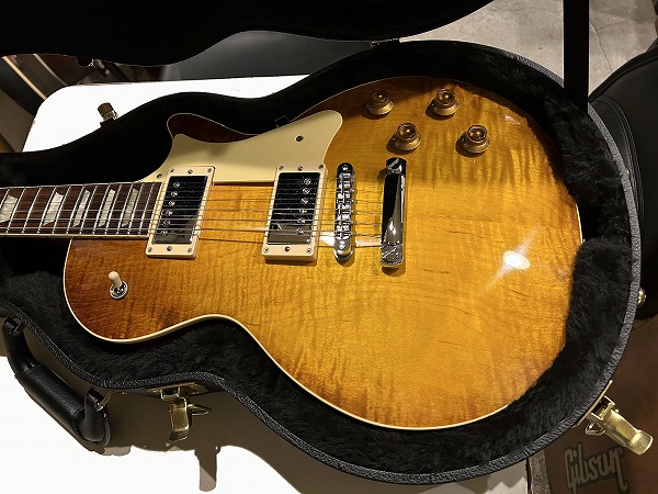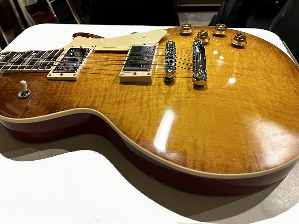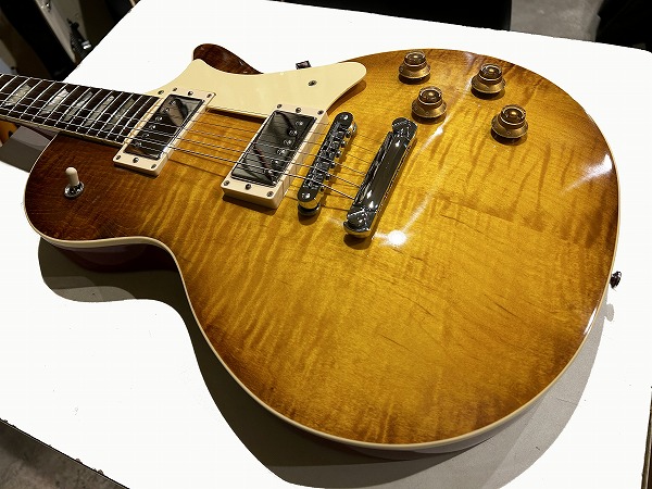 ShopラインもありこちらはStandatdラインのモデルですが、十分に美しい木目が綺麗に浮かび上がっており、上位グレードや本家Gibsonにもひけを取らないルックスです。バックはマホガニー、ネックもマホガニーのセットネック、指板はローズウッドといったLP伝統スペックを踏襲、いずれも木材もとても良質です。ジョイントもしっかりとディープジョイント仕様、丁寧で質の高い作りです。ソリッド仕様となっており重量は4.32kg(デジタルはかり実測)とやや重いですが、その分、タイトで引き締まった低音と伸びやかなサステイン、芯とハリのあるサウンドを提供します。ピックアップにはSeymour
