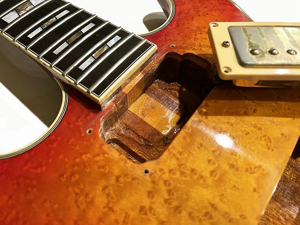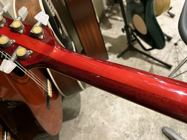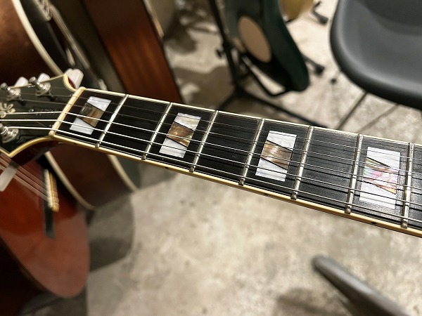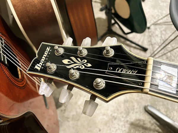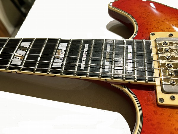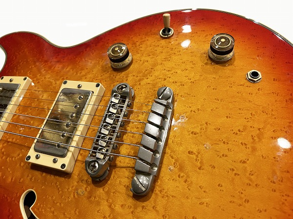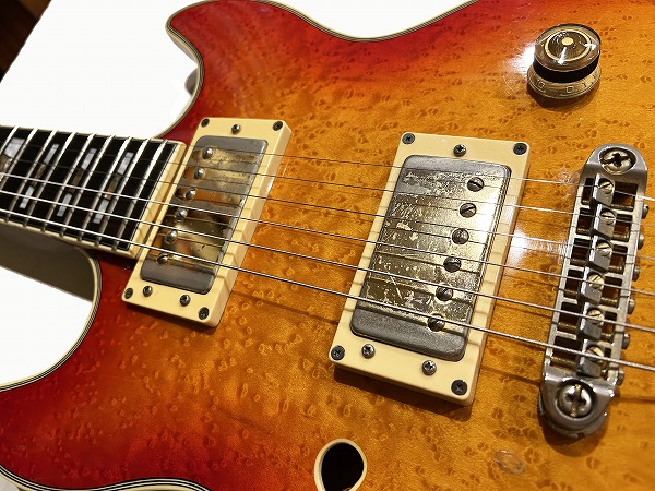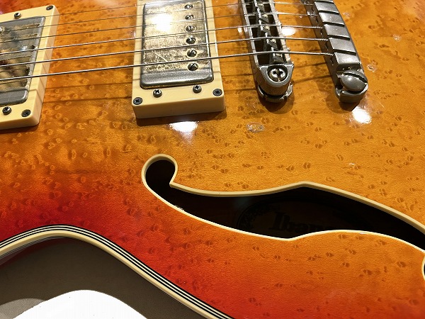その作りの良さは一見してもお分かりになるかと思います。トップは全面に美しいバーズアイの杢目がぎっしりと入ったバーズアイメイプルの滑らかなアーチドトップ、バックはこちらも木目も綺麗な上質なマホガニー、ボディは約35ミリ厚の薄型で、バックはエッジが落とされた滑らかなシェイプで非常に抱えやすく弾き心地抜群で、ボディ構造はセミホロウ構造で軽やかなエアー感、箱鳴り感を与えています。重量は2.99kg(デジタルはかり実測)と非常に軽量です。ネックも同様の良質マホガニーにセンター部にメイプルの入った3P構造で、強度と同時にハリ、芯のあるサウンドも確保しています。ジョイントはしっかりとセットネックのディープジョイント仕様です。指板には高級木材であるエボニーが採用され、ネックバインディング、ボディバインディングもある仕様。インレイはブロックタイプのアバロン装飾入りです。ピックアップにはIbanez