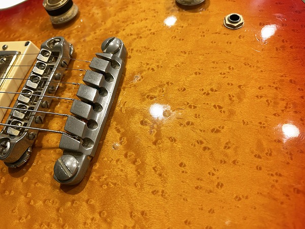 外観的には相応に小傷、金属パーツのくすみ、メッキ剥がれ、使用感、経年感はあります。ブリッジ下に元々はメタルプレートがあり、こちらは外され欠品しており、ビス穴を埋めた跡が残っています。その他ブリッジ横に1ヶ所少し大きめの打痕があります。ですが全体的には年式を考慮すると傷も少なく、まだまだ良好なグッドコンディションです。全体的に丁寧にクリーニング、磨きも行なっており綺麗なコンディションになっています。良い雰囲気のヴィンテージライクなルックスです。ケースはおまけとしてソフトケースをお付けいたします。