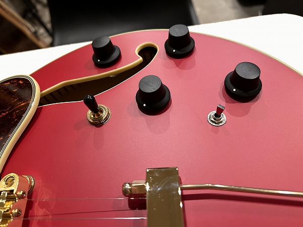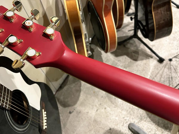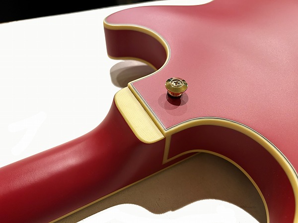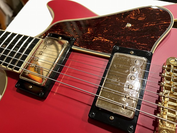 カラーはCherry Red Flatと呼ばれるマットカラーのレッドで、落ち着いた雰囲気が格好良く、ゴールドのハードウェア、べっ甲柄ピックガード等のルックスと併せ、高級感とトラディショナルな雰囲気も感じさせるクールなルックスです。