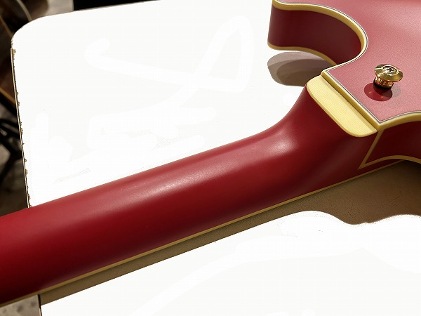 サウンドもとても良いです。小ぶりなボディのホロウサウンドでほど良い、かつ豊かなエアー感はもちろん、軽快ですがネックシェイプはやや丸めのしっかりとしたCシェイプで、ファットさと鳴り感を担保、かつマットの薄めの塗装は乾いたトーンと抜けの良さにつながっており、クリアーでスムースなトーンのSuper