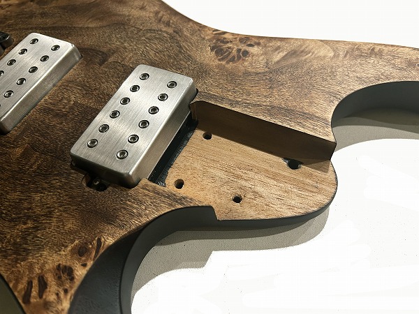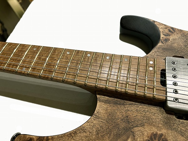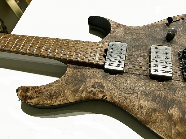 まずボディは独自の小ぶりなディンキーシェイプで、エルボー部やボディ上部は滑らかにアーチがつけられた薄めのボディで、抱えやすさ、演奏性の向上に徹底的に拘って設計されています。カッタウェイは深く、コンタード加工も入れられ、ハイポジションの弾きやすさも抜群です。ボディは豊かな中低音が特徴のニャトーバックに、トップは美しい杢目のポプラバールトップ、杢目の浮き出たサテンフィニッシュがルックスの美しさ、ゴージャスさを引き立てています。ネックは加熱処理が施され木材の水分や油がしっかりと抜かれたローステッドメイプルとブビンガの3Pとなっており、高い強度と安定感を誇ります。指板もローステッド・バーズアイメイプルとなっており、バーズアイの杢目が美しく、色味も綺麗でボディとのマッチングも抜群です。ジョイントは4点止めボルトオンで、落とし込みのワッシャー式でしっかりとした作りの安定したジョイントです。フレットはジャンボ