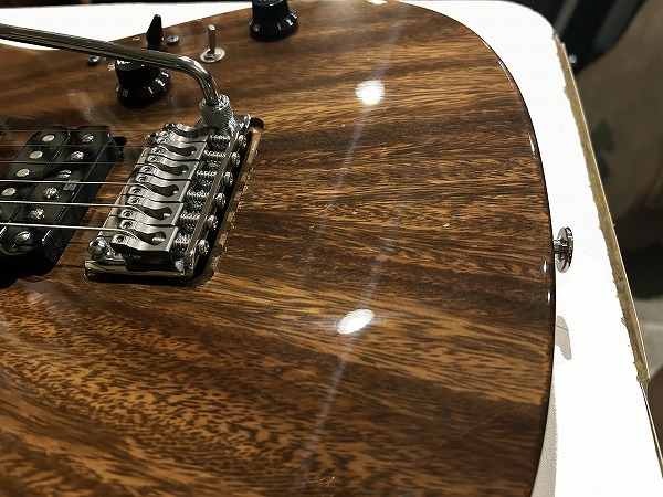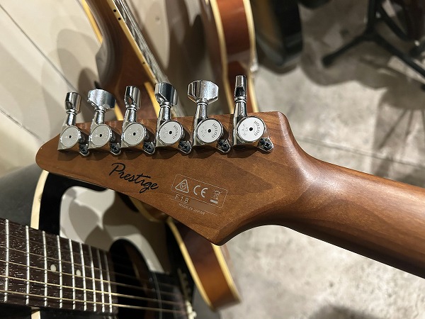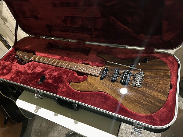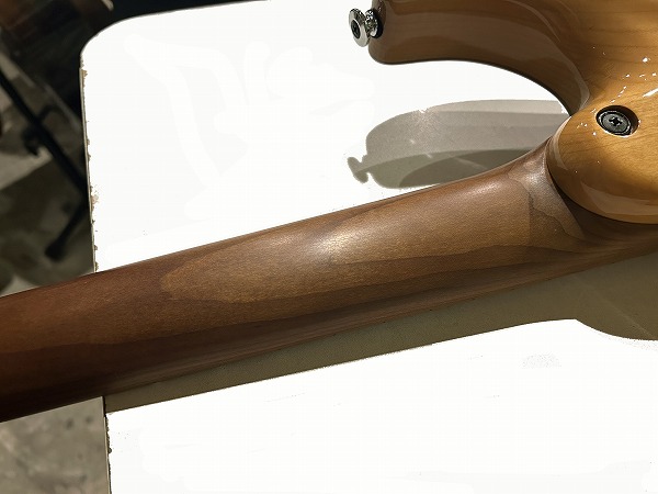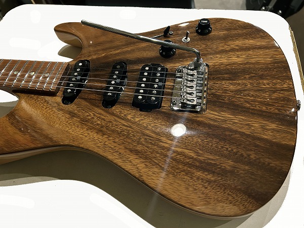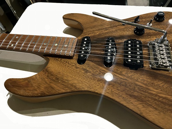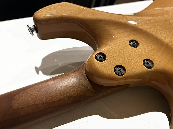 WOODローステッド・メイプルネックに指板もローステッド・メイプル貼り指板となっているのが特徴的です。メイプルですがグロスフィニッシュ塗装無しで、ローストのサテンフィニッシュなのがとても個性的で、サラっとした滑らかな演奏性も抜群です。ボディはグロスのクリアーフィニッシュです。ジョイントは4点止めのボルトオンジョイントで、ネックエンドはヒールレス加工され、大きくとられたボディカッタウェイと併せて、ハイポジションでの演奏性、弾き心地は抜群です。テクニカルプレイ、速弾き等にも対応するこのモデルの特徴的仕様です。フレットはステンレスのジャンボフレットで、耐久性高く、演奏性、ピッチの安定感、サステインの良さも抜群です。ブリッジは2点止めシンクロトレモロタイプで、繊細なアーミング、激しいアーミングプレイにも対応、ペグはGOTOHのロック式でこちらも安定したピッチ、サステイン、響きに寄与しています。ピックアップにはセイモア・ダンカンとの共同開発モデルHyperionをSSHレイアウトで搭載。5Way
