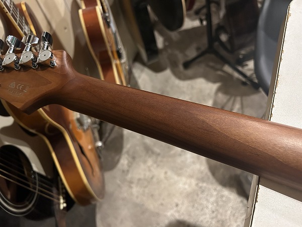 ボディはディンキーSTタイプ AZタイプのシェイプで、このシグネチャーモデルはアルダーバックに珍しいモンキーポッドトップを持っているのが特徴的です。サウンドのアルダーとのマッチングの良さはもちろん、独特な杢目を持ち、カラーリングともあいまって、派手すぎない落ち着いた雰囲気、トラディショナル感もあるルックスも魅力です。ネックの仕様もやや個性的な魅力を持っており、S-TECH