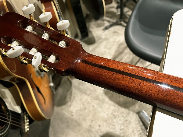 トップはこの価格ながらシダー単板、サイド&バックはローズウッド合板ですがこちらも杢目も美しい良い木材が使用されています。ネックはマホガニー、ローズウッド指板といった仕様で、いずれも良質な木材で丁寧に作られ仕上げられています。ペグはゴールドのプラスチックボタンといった仕様です。さすがは当時の国産ハンドメイド