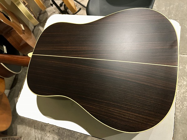 LO-120は通常のドレッドノートサイズを一回り小ぶりにサイズダウンしたボディが特徴的です。トップはスプルース単板、サイド&バックはインディアン・ローズウッド単板のオール単板仕様で、ネックはマホガニー、指板はエボニー、ブリッジもエボニーの、非常に良質な木材と丁寧な作りによる上質な1本となっています。写真からも美しい杢目や良質な木の質感、作りがお分かりいただけるかと思います。フィニッシュはサテンとなっており、木の質感が活かされたナチュラルなすべすべした触感や弾き心地の良さはもちろん、抜け良く生鳴り感豊かなダイレクトなサウンド、ナチュラルなウッドトーンにも活かされています。やや小ぶりなドレッドノートスタイルはレスポンスも良く、ローズウッドサイド&バックの瑞々しく、クリアーな透明感あるトーンと、スプルーストップのアコースティカルな柔らかな繊細なトーン、マホガニーネックはスイートさとウォームさも加味し、エボニー指板のタイトでクリアーな音像のトーンと相まって、非常にバランス良く、生鳴り良く、かつこもらず、粒立ちの良いブリリアントながら繊細なアコースティカルな上質トーンを奏でます。さすがはK.Yairiの上質手工国産アコースティックギターといった印象です。素晴らしいサウンドです。ナット幅42mm、細身・薄めの緩いVシェイプ気味でとても弾きやすく、小ぶりなボディと併せ演奏性も高いです。スケールは645mmです。