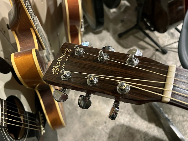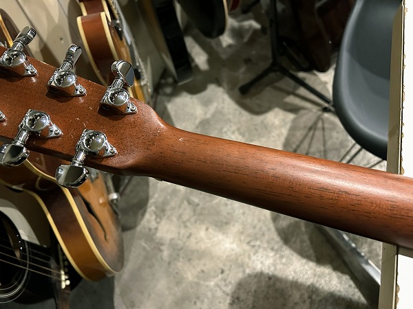 今回入荷したのはシリアルナンバー 「136****」の2009年製の1本。マホガニーサイド&バックのスイートで中低域もリッチでウォームなサウンドながらタイトなトーンと、スプルーストップのアコースティカルで繊細なトーンとのマッチングで、深いボトムと枯れた味わいやいなたさもあり、SSWやヴォーカルバック、弾き語りなどでも特に愛用される事も多いD-18の魅力を余すことなく再現した1本で、硬さも取れ、こなれ感、まとまり感もありながら抜けも良く、とてもグッドサウンドの1本です。アルペジオでの繊細なトーンニュアンス、木材のトーンの質感も、ダイレクトかつナチュラルに再現し、レスポンスも良いです。指板、ブリッジはローズウッド、ペグはGROVERの仕様の1本です。シンプルなブラックピックガード、ブラックバインディングのルックスもとても良いです。薄いラッカー塗装の質感、良質の木材のシンプルながら美しい杢目とあいまって、シンプルかつ上質で存在感のあるルックスです。ネック裏はマットサテンフィニッシュでさらっとした触り心地の滑らかで弾きやすいネックです。