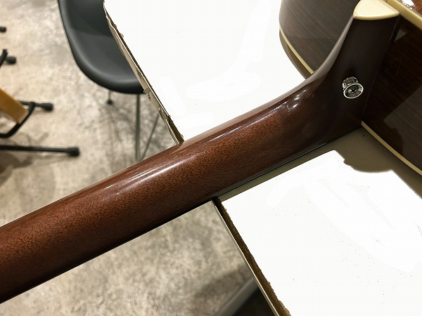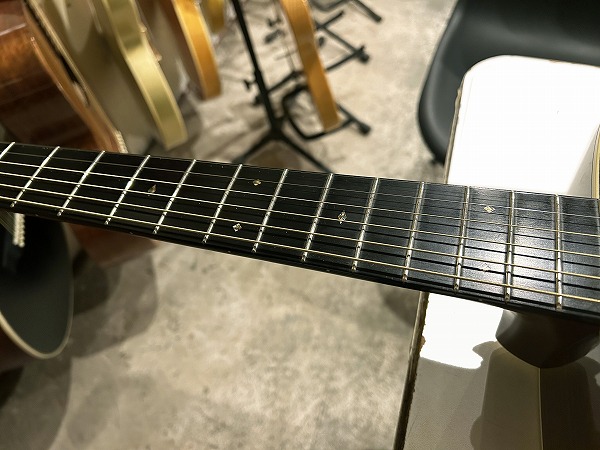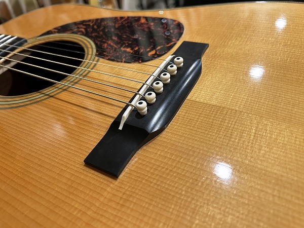コンディションも良好です。プレイコンディション良好で、演奏性、出音良好です。ネックは真っ直ぐで、トップのふくらみ、ブリッジ浮きやネック起きもありません。ロッドもまだ余裕があります。フレットもまだ7分〜8分程度は残っており、大きな減りやへこみ、弦溝も無く、丁寧に磨きも入れ、大分光沢も取り戻しています。指板も大きな減りやダメージは無く、こちらも丁寧にクリーニング・コンディショニングを行っており、綺麗なコンディションになっています。ブリッジサドルの高さも十分に残っています。弦高は12フレット上1弦1.8mm、6弦2.2mmとローアクションで弾きやすく、出音も良好です。各種メンテナンス、セッティング済みで、演奏性、出音共に良好のグッドプレイコンディションです。