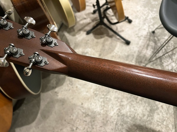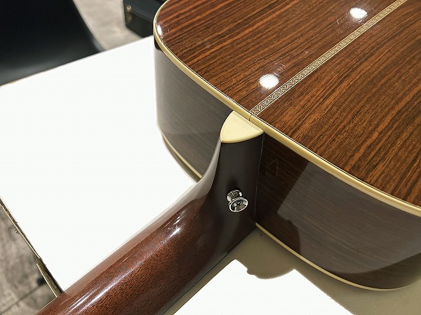 ボディはアディロンダック・スプルース・トップにインディアン・ローズウッドのサイド&バックのオール単板仕様、フォワード・シフテッド・スキャロップ・ブレイシング、エボニー指板、エボニー・ブリッジで、いずれも厳選された最上質の木材が使用されています。ネックは14フレット・ジョイント、ナット幅約45mm弱のVシェイプネックの戦前仕様、ダイアモンド・スクエア・インレイ、オープンバック・バタービーンノブのペグ、ボディのアイヴォロイド・バインディング、ロングサドル、べっ甲模様ピックガードなど、1930年代のヴィンテースペックを本格的に踏襲しています。ラベルのモデル記載は「D-28