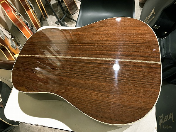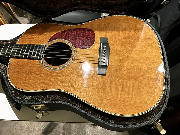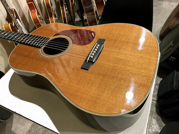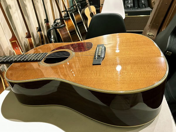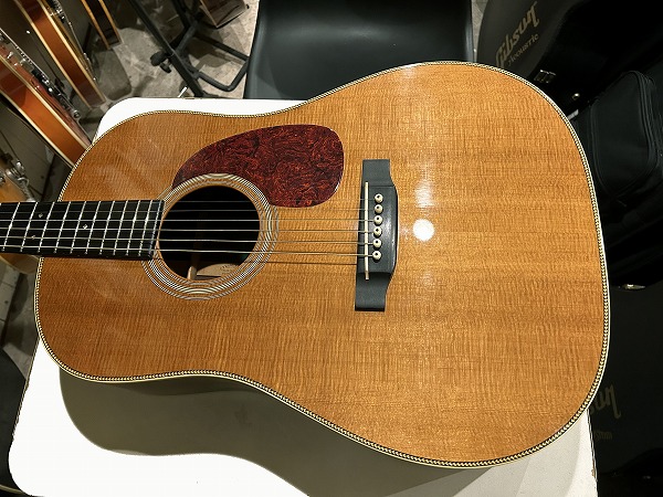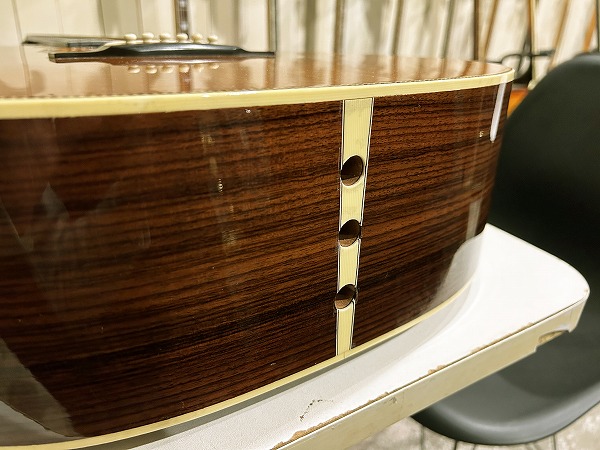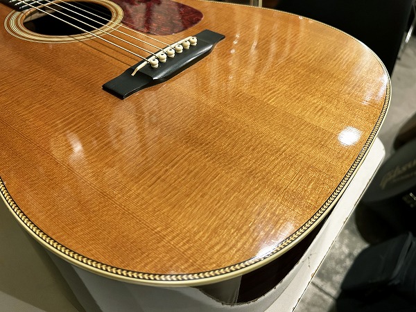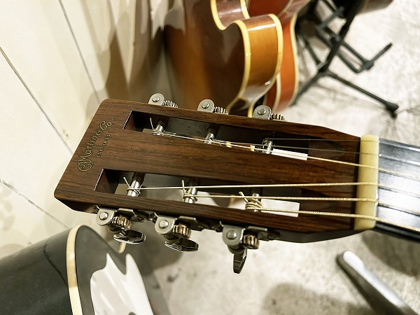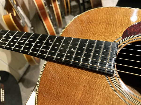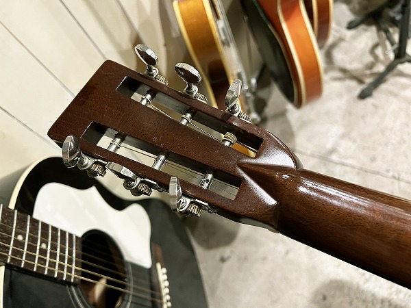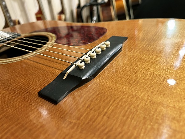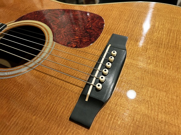 HD-28VS」です。トップはシトカスプルース単板、サイド&バックはインディアン・ローズウッド単板です。ネックはマホガニーで、ネックシェイプはVシェイプとなっているのもこのモデルの特徴で、Vシェイプですがやや薄めで太すぎず、ほど良いフィット感で弾きにくさはありません。指板はエボニー、ブリッジもエボニー、サドルはこちらもこのモデルの特徴であるロングサドルブリッジです。いずれも木目もとても綺麗で良質な木材が使用されています。またこのモデルの特徴として、ブレイシングがスキャロップドブレーシングのフォワードシフテッド仕様となっており、弦振動を損なわず、深く豊かで響きの良い、大きな音量感の生鳴りが特長です。さらにこのモデルの最も大きな特徴と言って良い仕様はジョイントが12フレットジョイントになっている点、そしてスロテッドヘッド仕様です。通常14フレットジョイントとも異なる、一体感のある深いウォームな鳴り感、響き、ハリのあるトーンが大きな魅力です。ピックストロークでの豊かな鳴り感とハリのトーンも良いですが、指弾きアルペジオでの深い低音とハリのあるクリアーな出音で特に威力を発揮する1本ではないでしょうか。とても素晴らしいサウンドの1本です。ルックス的にも、べっ甲タイプピックガード、ヘリンボーン・バインディング、指板のダイアモンドインレイ、ウェバリー・ペグなどヴィンテージライクで上質な存在感のあるとても格好良いルックスです。