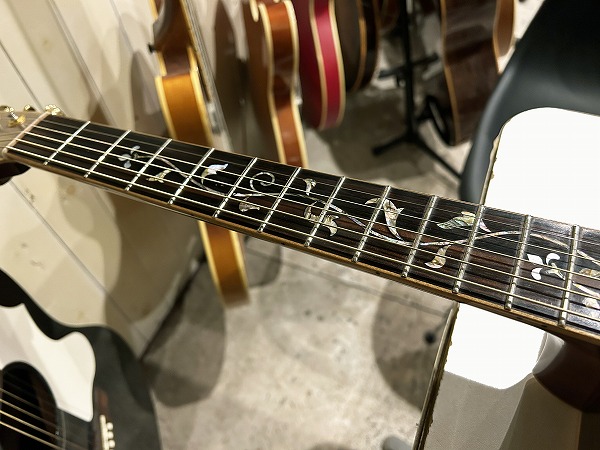年式定かではありませんが90年代のモデルで、Made In Japan、当時希望小売価格で¥200,000-の、Mシリーズ最上位グレードモデルの1つです。ドレッドノートサイズのボディに、トップはスプルース単板、サイド&バックはローズウッド単板のオール単板仕様、ネックはマホガニー、指板はローズウッドといった仕様です。ハイグレードモデルだけあり上質材が使用され丁寧に作られています。ルックス・仕様もゴージャスです。目を惹く指板のインレイはもちろん、指板サイドやボディバインディングはメイプル材にて上質感・ハンドメイド感を高め、トップ側のバインディングの凝った装飾、サウンドホール周りのアバロン装飾、ゴールドのハードウェアなど、シンプルな落ち着きのある雰囲気もありながら、ゴージャスで上質なルックスです。