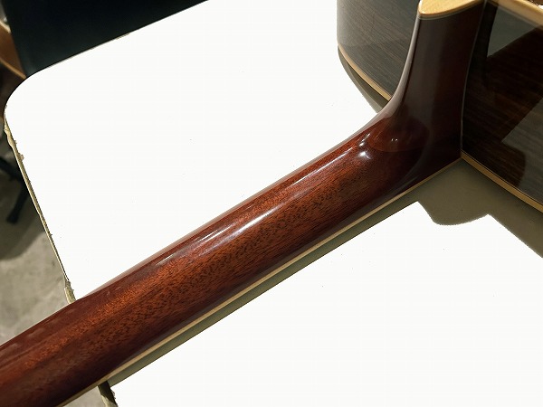 プレイコンディションは良好です。ネックは反りも無く真っ直ぐで良好な状態です。ロッドもまだ若干の余裕があります。フレットは相応に使用感、減りは見られますが、6分〜7分程度は残っており、大きなへこみや弦溝はなく、丁寧に磨きも入れ、光沢のある綺麗なコンディションになっています。指板も相応に使用感、小傷ありますが、大きな減り、傷、ダメージはなく、こちらも丁寧にクリーニングの上、コンディショニングも行っておりますので、綺麗で良好なコンディションになっています。ナット、ブリッジ溝も大きな減りも無く、良好な状態です。ネック起きやブリッジ浮き、トップのふくらみもありません。現在弦高は12フレット上1弦2mm、6弦2.5mmで、弾きやすく、出音も良好です。プレイコンディションは良好です。