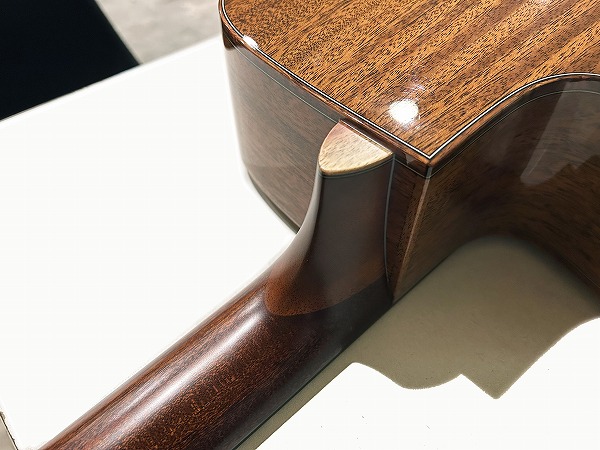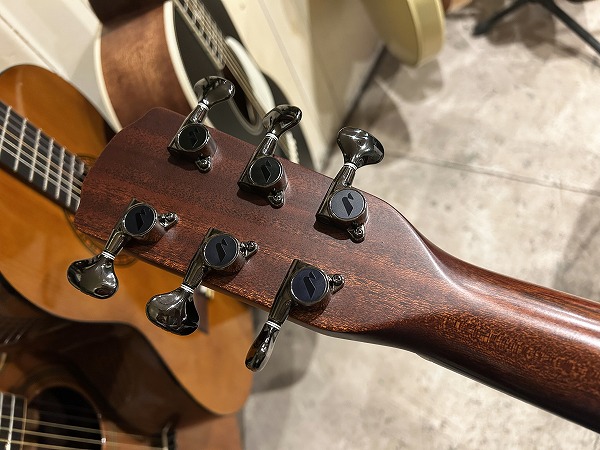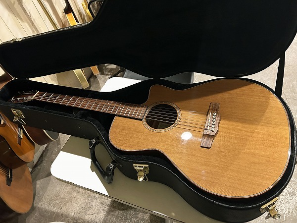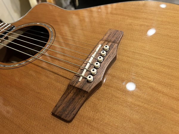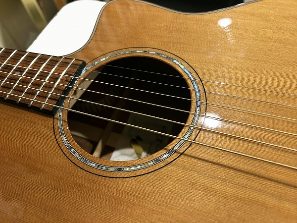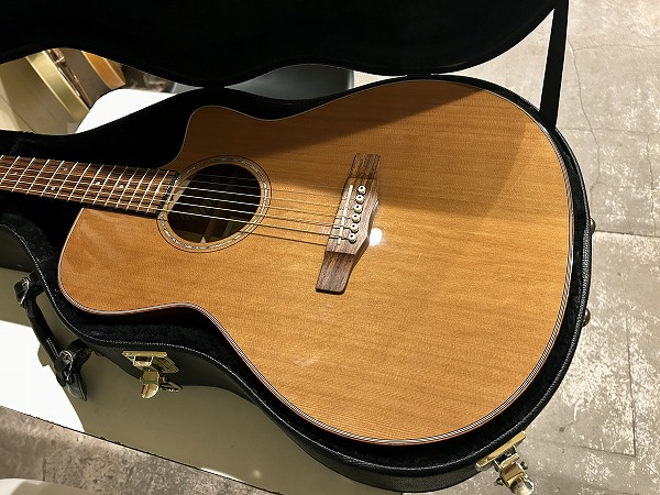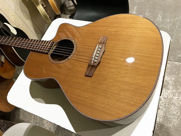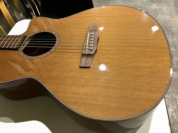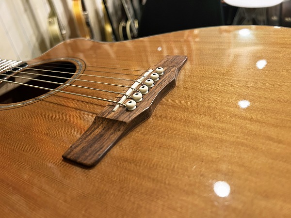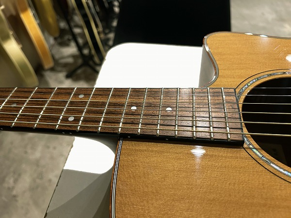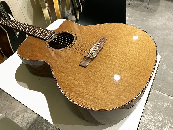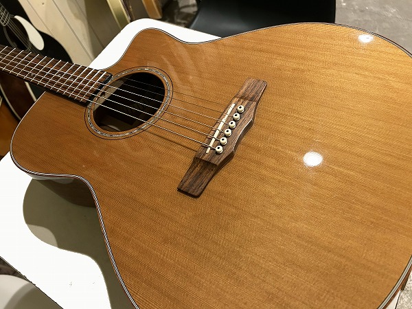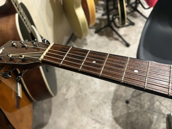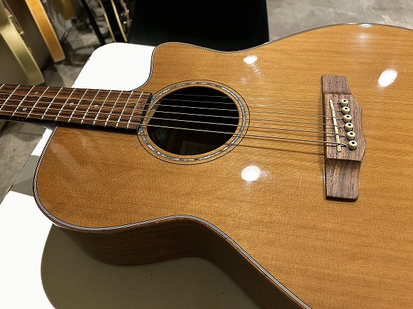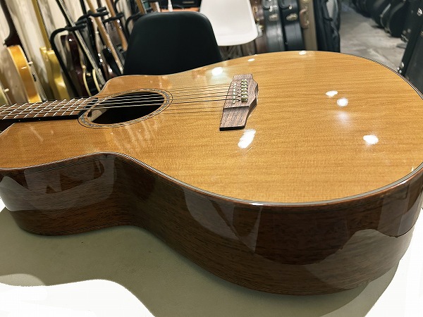 ほど良いサイズ感、厚みのグランドオーディトリアム、ベネチアン・カッタウェイボディはトップはシダー単板、サイド&バックはマホガニー単板となっており、ネックもマホガニー、指板はローズウッド、ブリッジもローズウッドといった仕様です。ナット幅は44mmとやや広めですが、ほどよい厚みの薄さのCシェイプで弾きやすく、フィンガースタイルに適したスタイルです。調整・最終検査まで国内ルシアーによって行なわれた弦高セッティングもとても弾きやすく出音、鳴り良好で、12フレット上1弦1.5mm、6弦2mmのローアクションさは国産・国内モデルならではかと思います。基本的にフィンガースタイル仕様に作られたモデルだけあり、単音爪弾きでも深く鳴りの良い響き、音量感、抜け良く粒立ち良く伸びやかな高音は、たしかな設計、作りと仕様ならではです。ブリリアントながら優しくやわらかなトーンと表現力、バランスの良いサウンドと、弾きやすく演奏性高く、安定した出音と豊かな音量感の、さすがはモーリスによるとても良質な1本です。