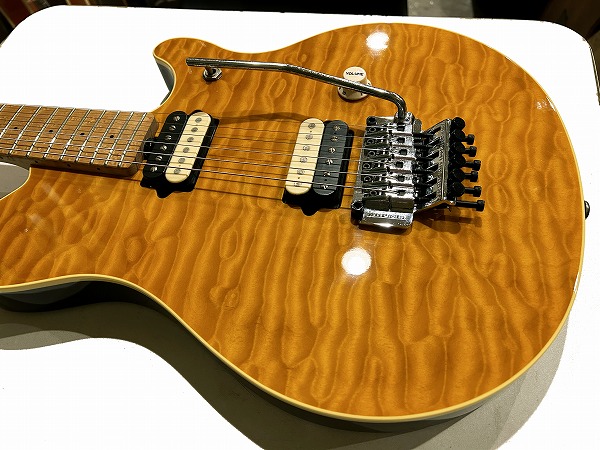 ボディは美しい極上キルトトップに、ボディバックはバスウッド、ネックは所々にバーズアイが浮き出たバーズアイメイプルネックです。トップはキルトメイプルをメイプルの上に貼り合わせる形となっています。コストダウンを実現しながら、極上の美しい杢目のルックスも実現しており、くっきりと杢目が浮かび上がり、トランスゴールドのカラーと相まって、非常に美しく高級感・存在感のあるルックスです。ネックは22F、貼りメイプル指板の仕様です。ネックはオイル&ワックスブレンドフィニッシュで、スベスベした触り心地、弾き心地の良い演奏性です。ヘッド部はトップ〜ネック裏共にクリアー塗装が施されています。ナット幅は約41mmと細身で、ネックシェイプは6弦側にやや比重のある非対称シェイプで、グリップ感の良さと、高音側の弾き心地の良さで、テクニカルなプレイや速弾きにも対応する計算された設計となっています。ヘッドストックのロゴはERNIE