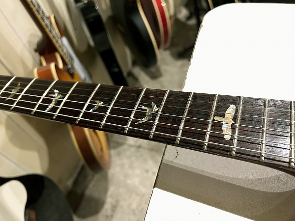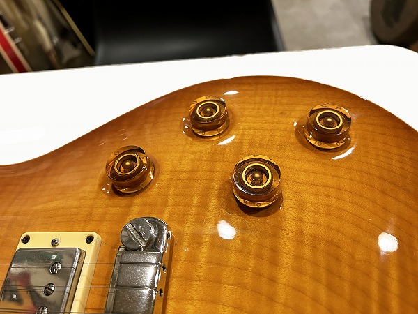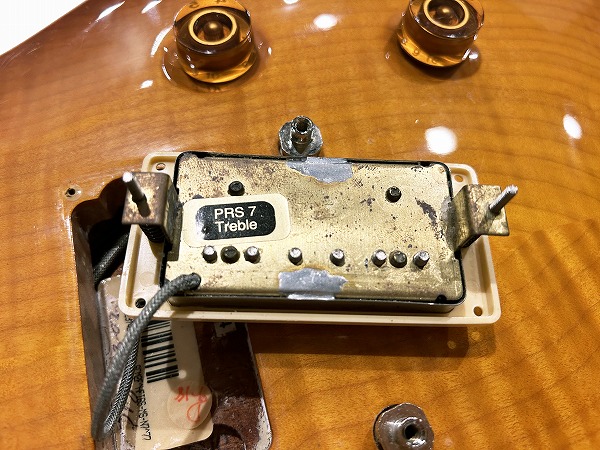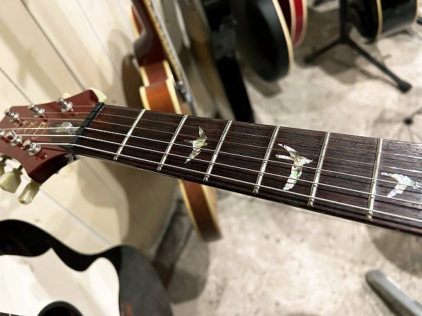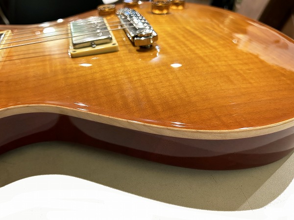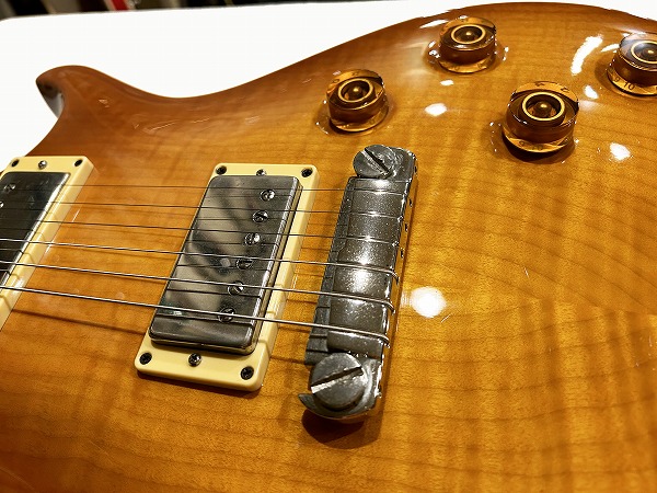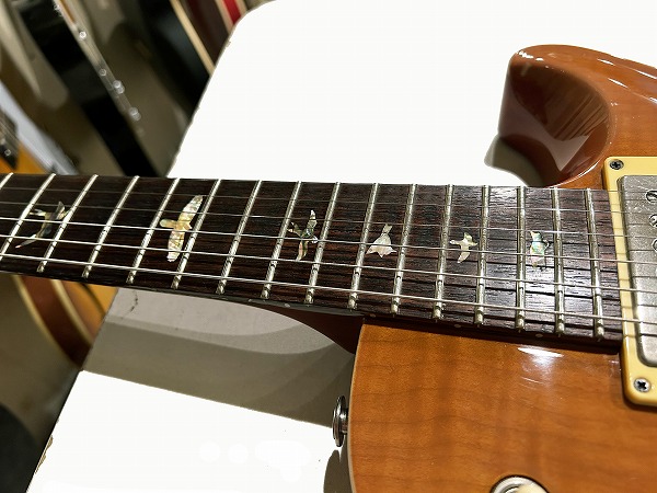 Fatの1本です。いずれも木目もとても綺麗な非常に良質な木材が使用された上質な作りで、トップのメイプルも厚みもしっかりと取られ流麗なカーブを持ったトップとなっており、10Top仕様ではありませんがトラ杢もほど良く綺麗に入っており、シンプルながら美しくゴージャスなルックスです。ソリッド仕様で重量4.39kg(デジタルはかり実測)とやや重めではありますが、その分、タイトで引き締まったローとファットで中低域も豊かなワイドレンジな鳴り、マホガニーの質感も豊かなスイートでタイトなトーン、厚みもしっかりあるメイプルトップのハリと芯のある抜け良いトーンに粘りとサステインのバランスを実現しています。ピックアップは非常に評価が高く当時はPRS史上最高のPUとの声も高かったPRS7