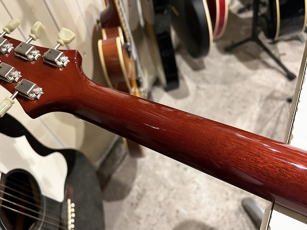 指板インレイはバードインレイ、ロッドカバー部にもアバロンインレイが入っています。ペグはクルーソンタイプのグリーンキータイプです。ボディバインディングはありませんがバインディングにあたる部分がナチュラルのメイプルを残してクリアーフィニッシュされており、トップの木目、カラーリングとあいまってナチュラルで上質なルックスです。全体的に、仕様・サウンド・ルックス共にやはりクラシカルなレス・ポールを踏襲しつつモダン・アップグレードされた上質モデルといった印象です。派手過ぎず落ち着いたクラシックスタイルのモダンモデルがお好みの方には最適の1本ではないかと思います。