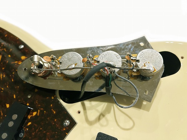 パッシブ仕様、コントロールは2Vol 1Toneとオーソドックスなタイプです。ポットはCTSと電装系もUSAパーツ仕様、キャビティは導電塗料もしっかり塗られノイズ対策も丁寧です。良質材が使用され、丁寧に作られた1本は派手さこそないかもしれませんが、さすがは老舗国内工房系の、しっかりとした間違いの無い良質な1本といった印象です。良質な作りに裏打ちされ、演奏性、サウンドもたしかな1本です。粒立ちの良いクリアーでタイトなサウンドで、芯があり、安定感のあるJBサウンドです。