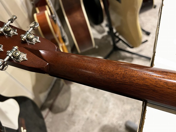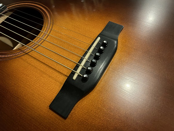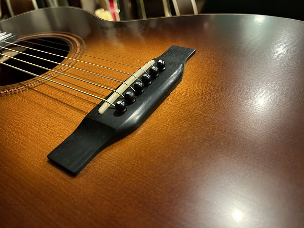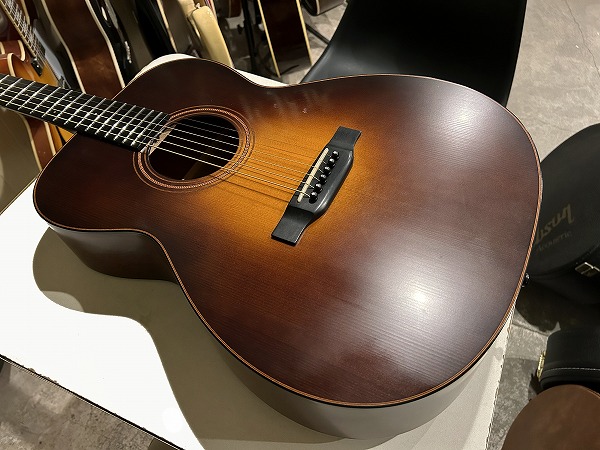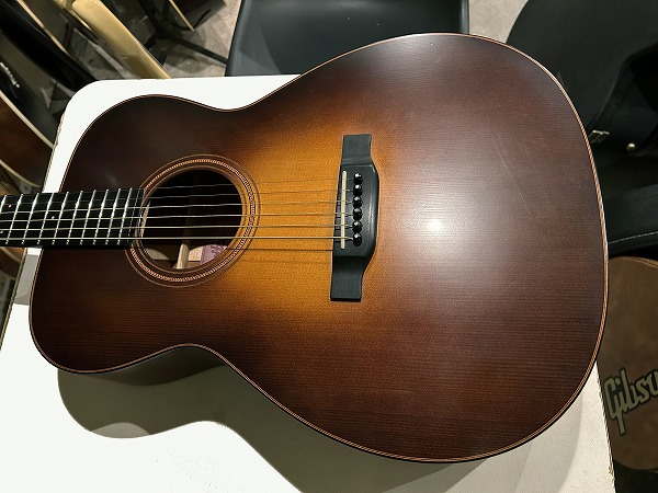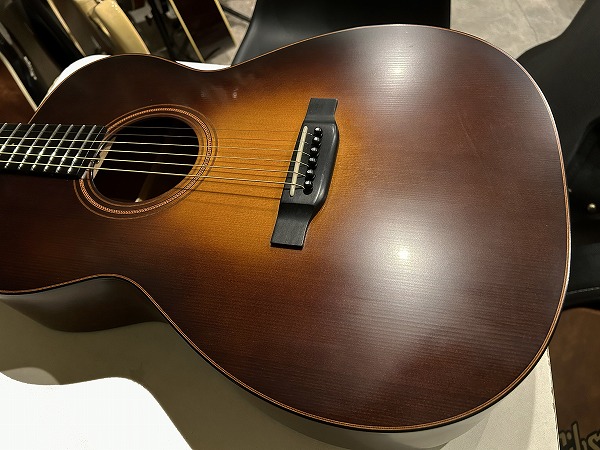 ボディはOMスタイルに、トップはアディロンダック・スプルース単板、サイド&バックはホンジュラス・マホガニー単板のオール単板仕様、ネックはアフリカン・マホガニー、エボニー指板&ブリッジ、648mmスケールといった仕様のモデルで木材はいずれも厳選された非常に上質なものが使用され、木目も綺麗でその作り、仕上がりも非常に上質です。マット仕様のサンバーストカラーはヴィンテージライクですが、ボディのバインディングはべっ甲仕様、サウンドホール周りの装飾や、エボニー指板&ブリッジ等とのマッチングもあいまって、落ち着いた雰囲気ながらとても上質感もあります。ナットは牛骨43mm、サドルも牛骨、フレットはステンレス・フレット、ペグはGOTOHのオープンタイプです。