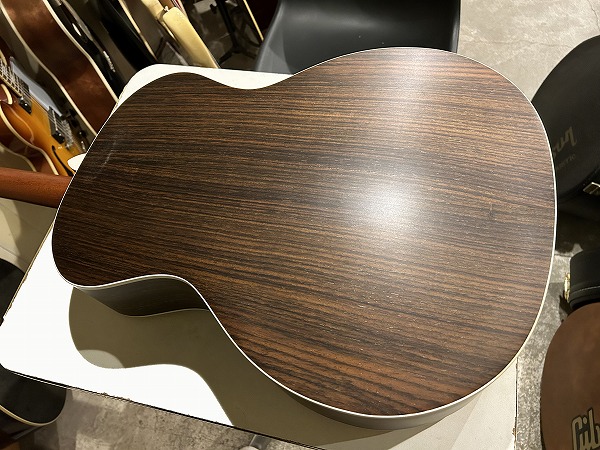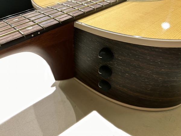 ボディはカッタウェイ無しのグランド・オーディトリアム、トップはシトカ・スプルース単板、サイド&バックはこの時期はサペリのオール単板仕様との情報もありますが、現物目視で外側の木目やサウンドホール内部の木目等を確認する限りでは、ローズウッドの合板仕様と思われます。正確なカタログスペックは不明です。いずれにしても綺麗な良質木材が使用されており、トップのみグロスフィニッシュ、サイド&バックはサテンフィニッシュです。ネックはマホガニーでこちらもサテンフィニッシュです。指板とブリッジはローズウッドです。サウンドホール内ラベルのモデルナンバーは「214e」、シリアルナンバーは「2007*******」の11桁シリアルです。ブレイシングはスキャロップド・Xブレイシングです。ピックアップにはESシステムを搭載しています。