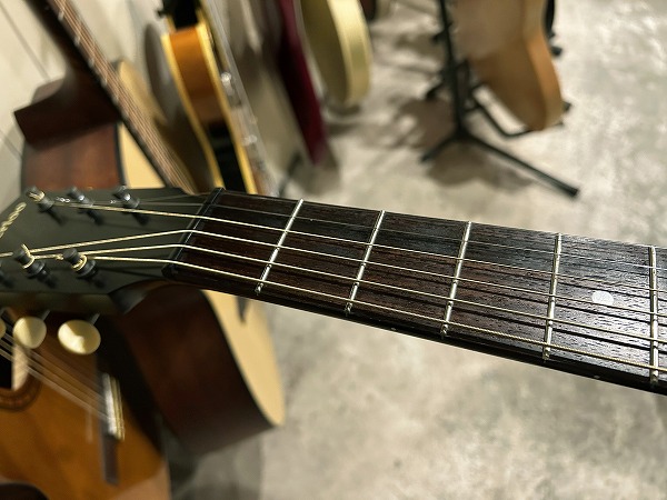 L-00などの系譜を踏襲したモデルですが、さすがは Waterloo by Collings による圧倒的拘りによる作り、仕上がりとなっています。ボディはスプルース単板トップ、マホガ二ー単板サイド&バックのオール単板仕様で、木目、導線の入り方も美しい最上質のものが使用されています。フラットトップ、サイズ感はボディ下部の一番広い部分で幅おおよそ375mm、ショルダー部でおおよそ258mm、ボディ厚はおおよそ15mm(いずれも実測)となっており、コンパクトながら箱鳴り感豊かなサウンドです。ブレイシングはXブレイシング仕様のモデルです。ネックも同様の上質マホガニー、指板はローズウッド、ブリッジはエボニーといった仕様です。ネックはヴィンテージVシェイプを持っているのも大きな特徴で、ヴィンテージライクな、厚みのあるVシェイプは、生鳴り、響き、音の太さ共に抜群です。ナット幅は約44,45mm、スケールは約632mmです。しっかりとしたグリップのVシェイプですが、握り込みやすく、弦高設定も比較的ローアクションな為、弾きにくさもなく、弾きやすく演奏性も高いです。こちらはトラスロッドありの仕様で、調整にも対応するモデルです。