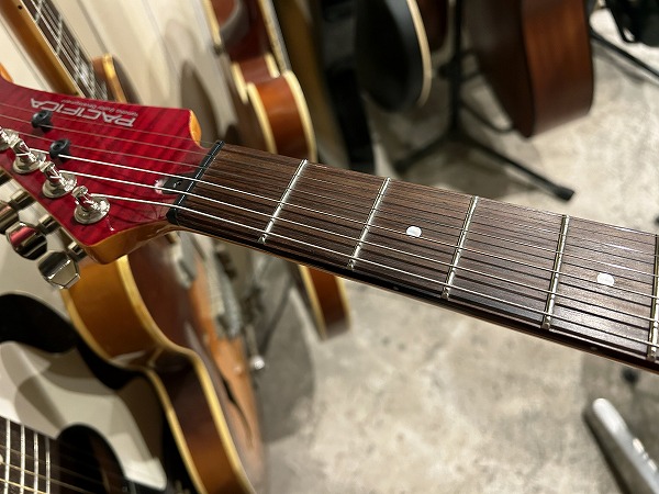 ボディはPacificaオリジナルの、カッタウェイも深く、コンターも深く、シェイプも小ぶりで抱えやすさ、弾きやすさ抜群のオリジナルSTシェイプ。ボディ材はアルダーに、トップには美しいフレイムメイプルを採用し、非常に美しく高級感のあるルックスです。ネックはメイプル+ローズウッド指板、350Rのややフラットなモダンな仕様に、22フレット仕様、フレットはミディアムフレットです。ナットにはグラフテック・タスクナットを使用、ナット幅41mmで細身のネックです。ペグはGROVERのロッキングチューナーが採用され、ブリッジにはウィルキンソン