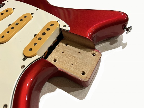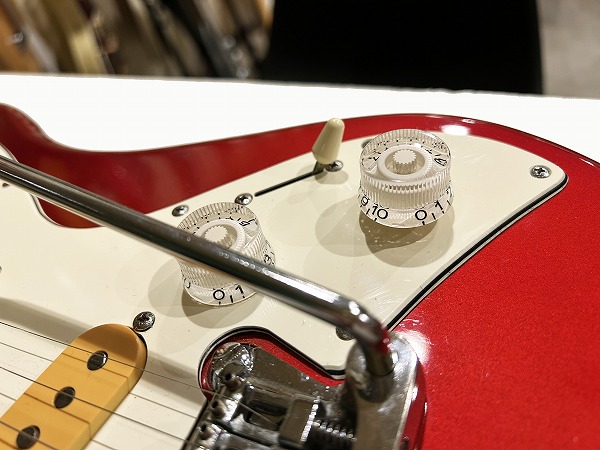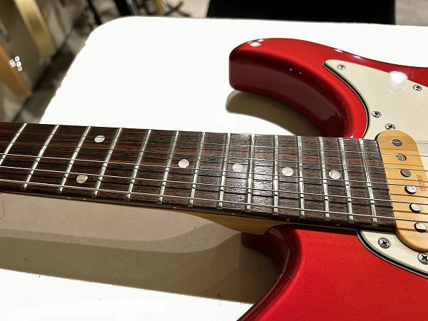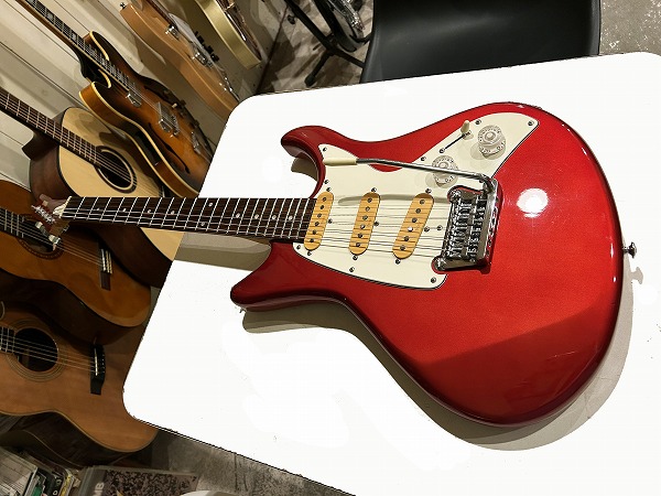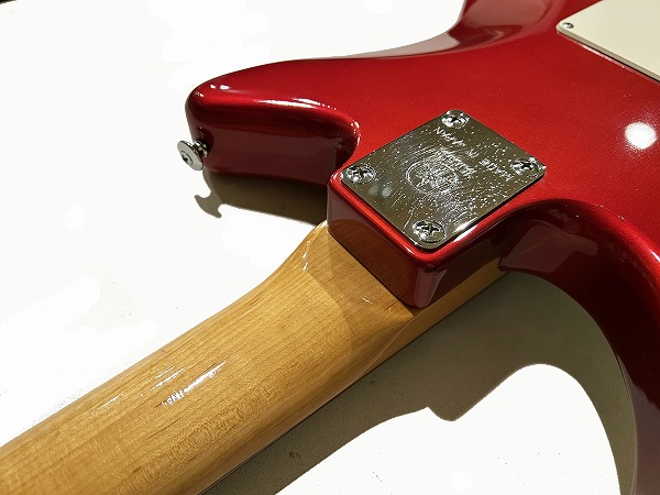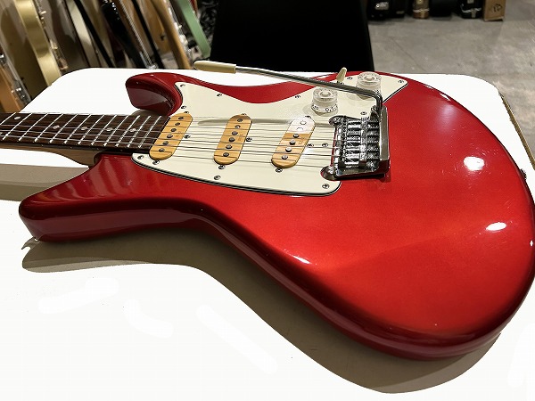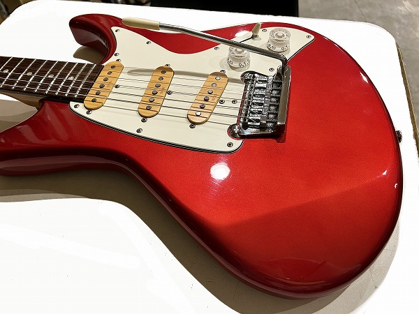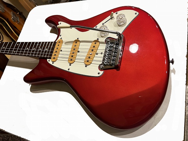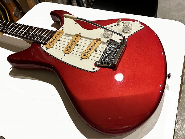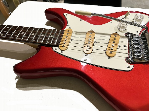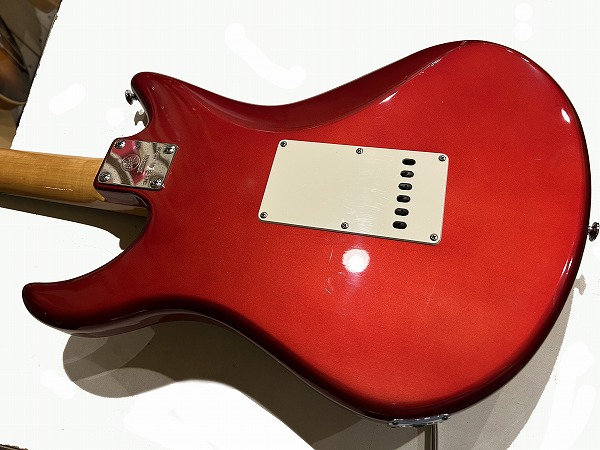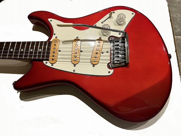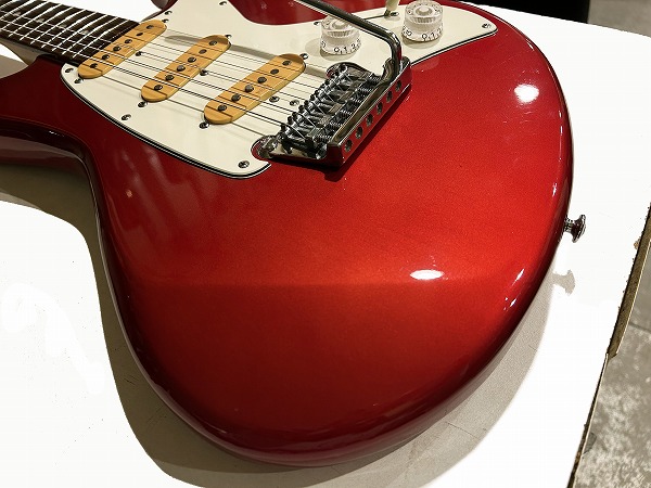 ボディはオリジナルシェイプの魅力的なフォルムでしっかりとアルダー材が使用され、バランスの良いしっかりとした芯のあるサウンドです。カラーはCTR、メタリックレッドのようなカラーです。ネックはメイプル、指板もローズウッドとしっかりとしたスペックで良い材が使われています。ボルトオンジョイント、ネックはナット幅約41mmの細身のCシェイプで弾きやすく、22フレット仕様、やや厚みのあるスラブボード仕様なのも特徴です。これによりスッキリとした瑞々しくクリアーなトーンを生み出しています。ブリッジはオリジナルのトレモロユニット搭載、アームバーも付属します。ピックアップはオリジナルのシングルを3基搭載、コントロールは1Vol、1Tone、5Way