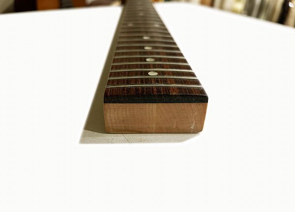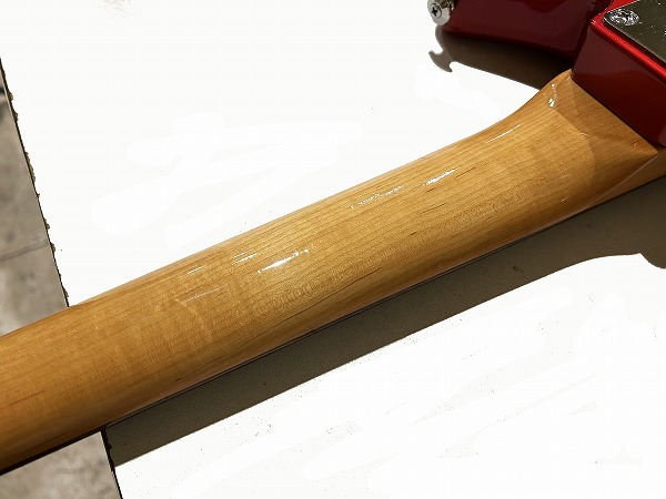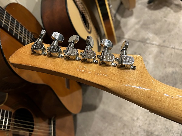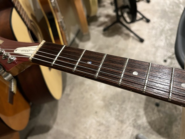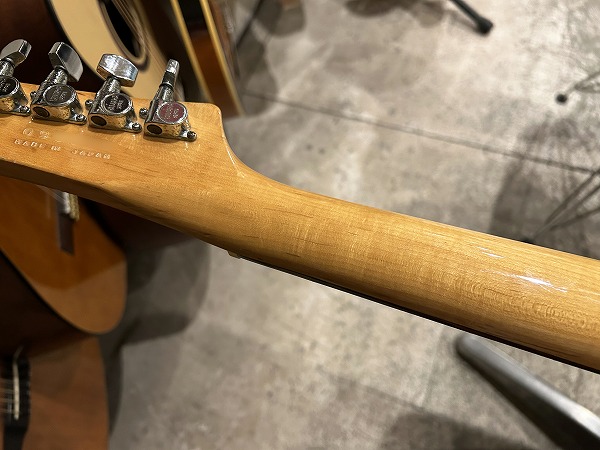 プレイコンディションは良好です。ネックは大きな反りも無くほぼ真っ直ぐで良好な状態に調整済です。ロッドは順反り矯正方向に一杯に回しきった状態です。ロッドは順反り矯正方向にほぼ回しきった一杯の状態ですが、現状使用上は良好なプレイコンディションです。フレットも相応に減りが見られ、軽度のへこみも見られ、6分~7分程度の残りとなっていますが、大きなへこみや弦溝は無く、弦高ローアクションセッティング可能で出音も良好です。指板も相応に小傷、若干の減り、使用感などありますが、大きな減りや大きなダメージは無く、指板も丁寧にクリーニングの上、コンディショニングも行っています。全体的にしっかりとメンテナンス、セットアップを施しており、現在弦高は12フレット上1弦1.5mm、6弦1.5mmです。電装系、コントロール、出音も問題ありません。前述のようにトーンはPUSH-PULLスイッチに交換されています。調整、セットアップ済で、弦高ローアクション、弾きやすく出音良好のグッドプレイコンディションです。